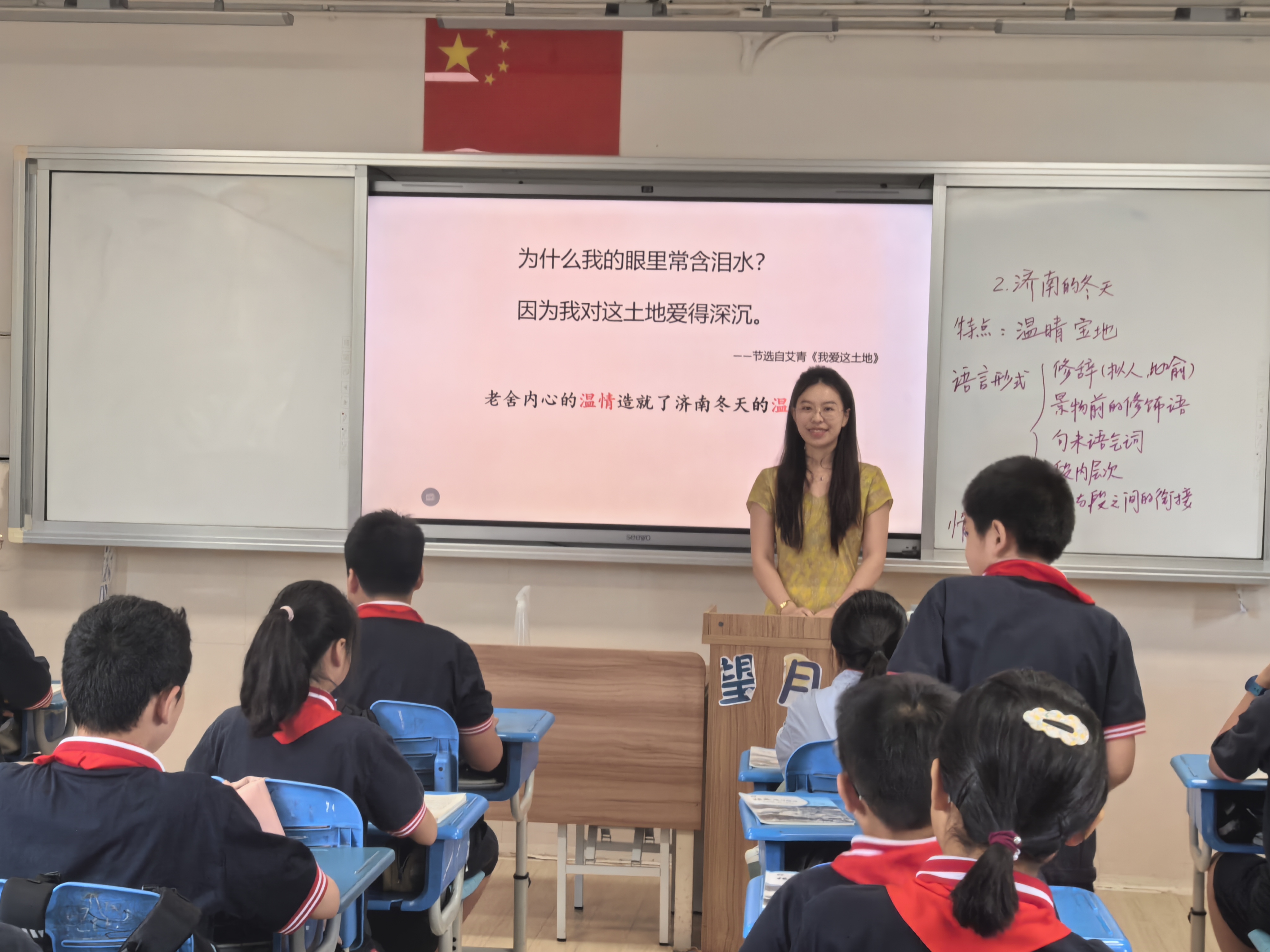 第一节公开课由七年级张璇老师执教《济南的冬天》。张璇以“通过分析语言形式把握作者思想情感”这一核心问题,引导学生细读文本,捕捉老舍笔下济南冬天的景物特征与情感氛围。她通过设置真实情境,帮助学生从“读景”走向“解情”,融合语言学习与文化理解,课堂体现了较强的整合性与实践性,学生主动参与、思维活跃,展现出良好的语文综合能力。
