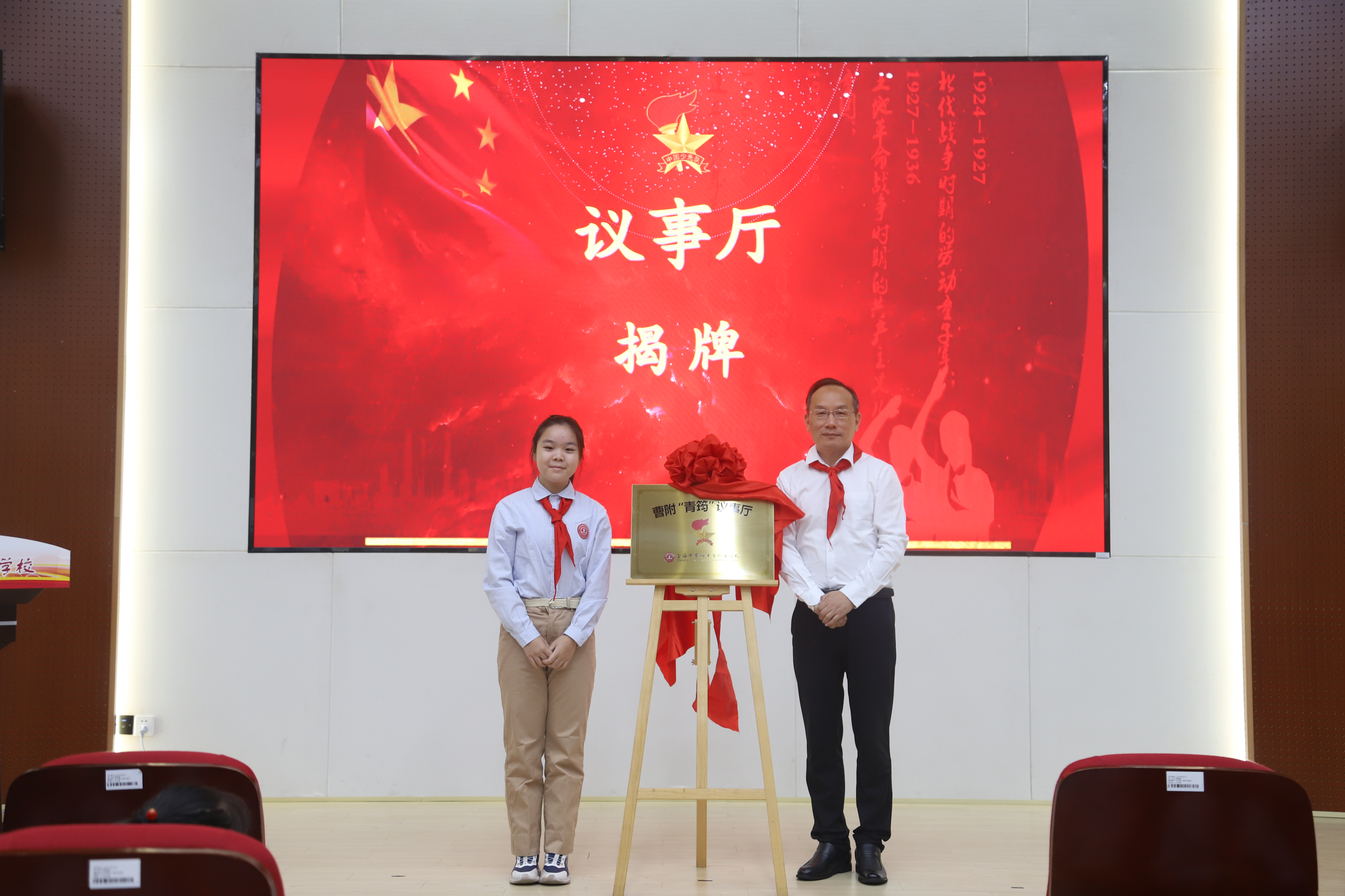 “下面,有请张明民校长与队员代表共同为‘曹附青筠红领巾议事厅’揭牌!” 随着话音落下,红绸缓缓揭开,“青筠红领巾议事厅” 几个大字格外醒目。“青筠”指青竹,学校有片竹林,是队员们学习阅读探讨的风水宝地。竹象征虚心有节(尊重)、茁壮成长(树人),与学校办学理念一致,少先队员如青竹般向上生长、坚韧有节,且“筠”与“耘”谐音,寓意辛勤培育的全体曹附老师。