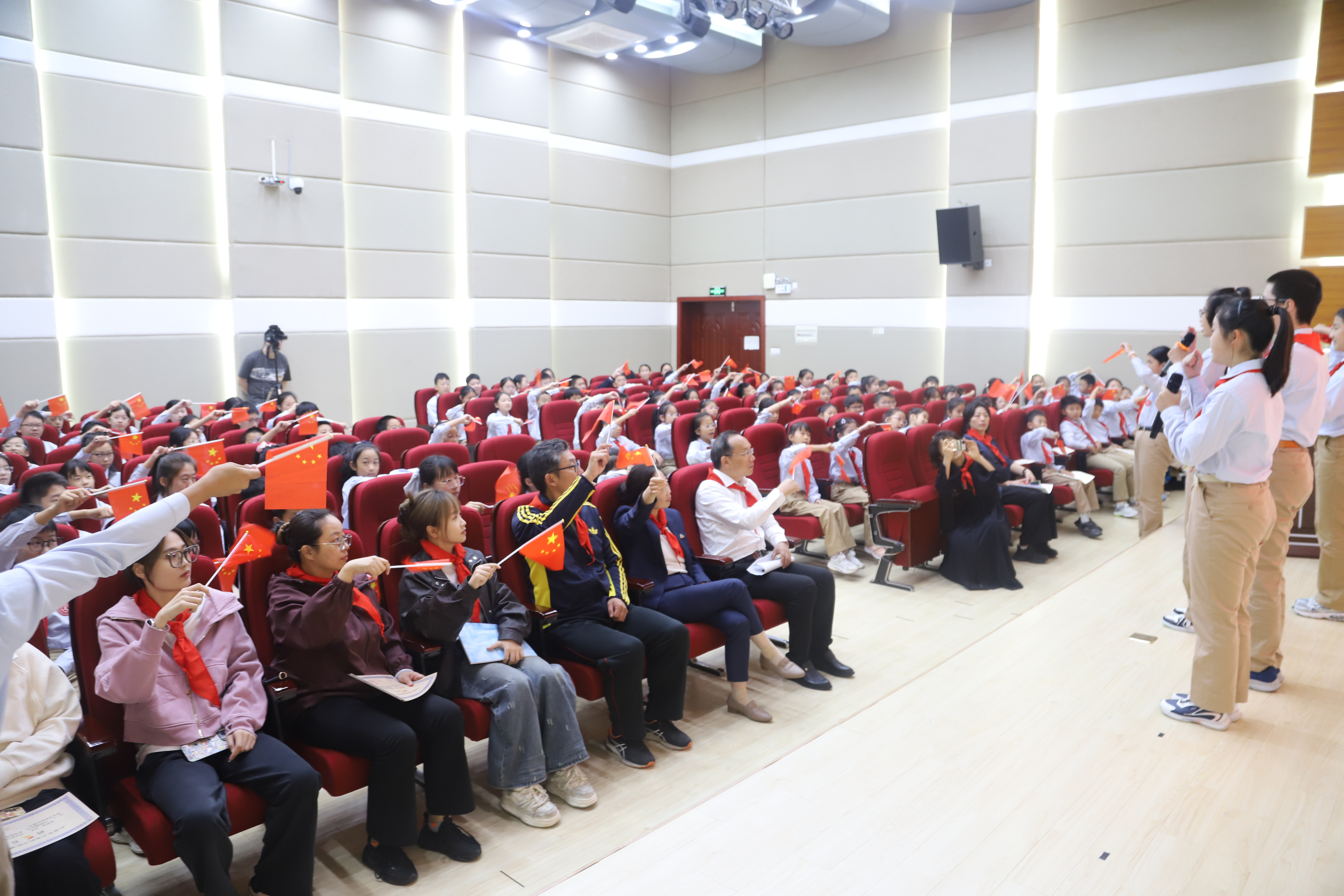开幕式会场被庄重的氛围包裹,队员们身穿正装,带着鲜艳的红领巾,眼中满是期待的光芒。“出旗!” 指令落下,队旗在旗手的护送下缓缓前行,鲜红的旗帜掠过每一位队员的眼前;紧接着,《中国少年先锋队队歌》的旋律响起,全体队员放声高唱,嘹亮的歌声回荡在会场上空。胸前的红领巾随风轻扬,少年们昂首挺胸,眼神里满是作为少先队员的骄傲与荣光。